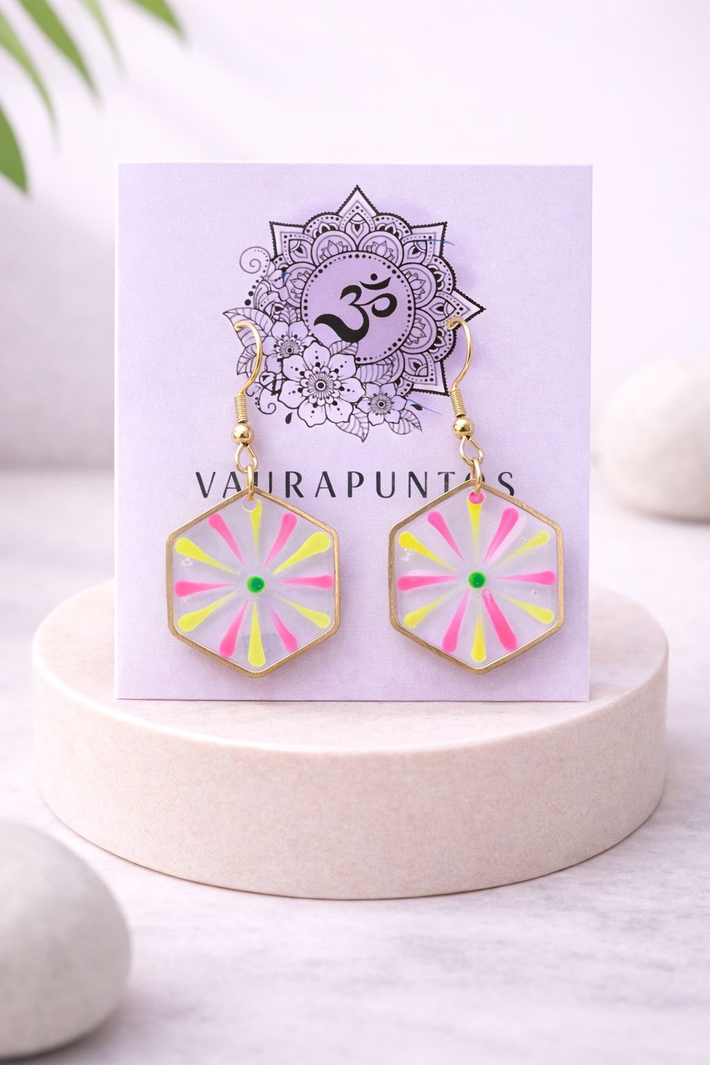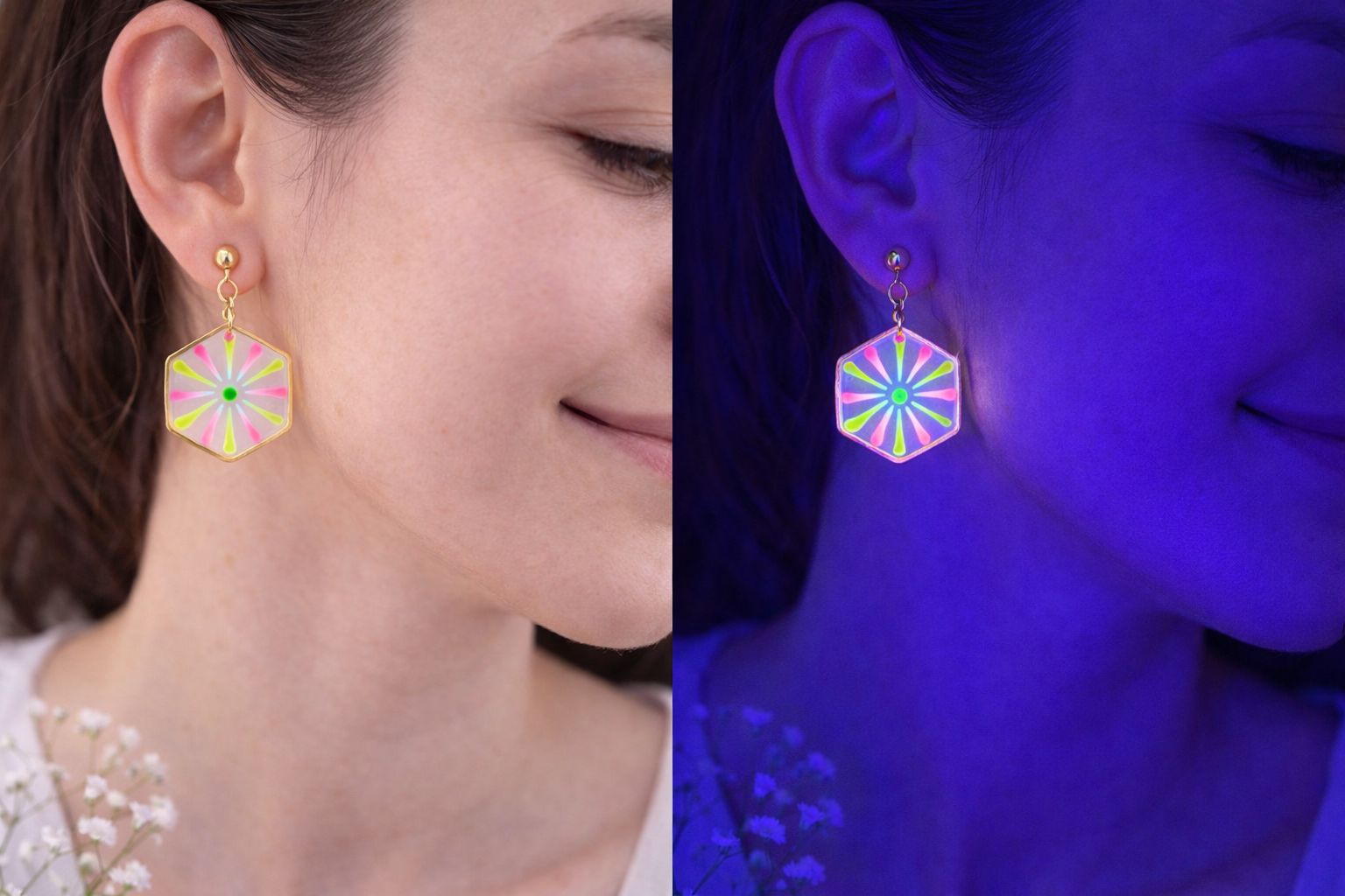Ilumina tu estilo con una pieza única que brilla con personalidad. Hechos a mano, estos aros incorporan pigmentos fluorescentes que destacan sutilmente en la luz y revelan todo su efecto con luces UV.