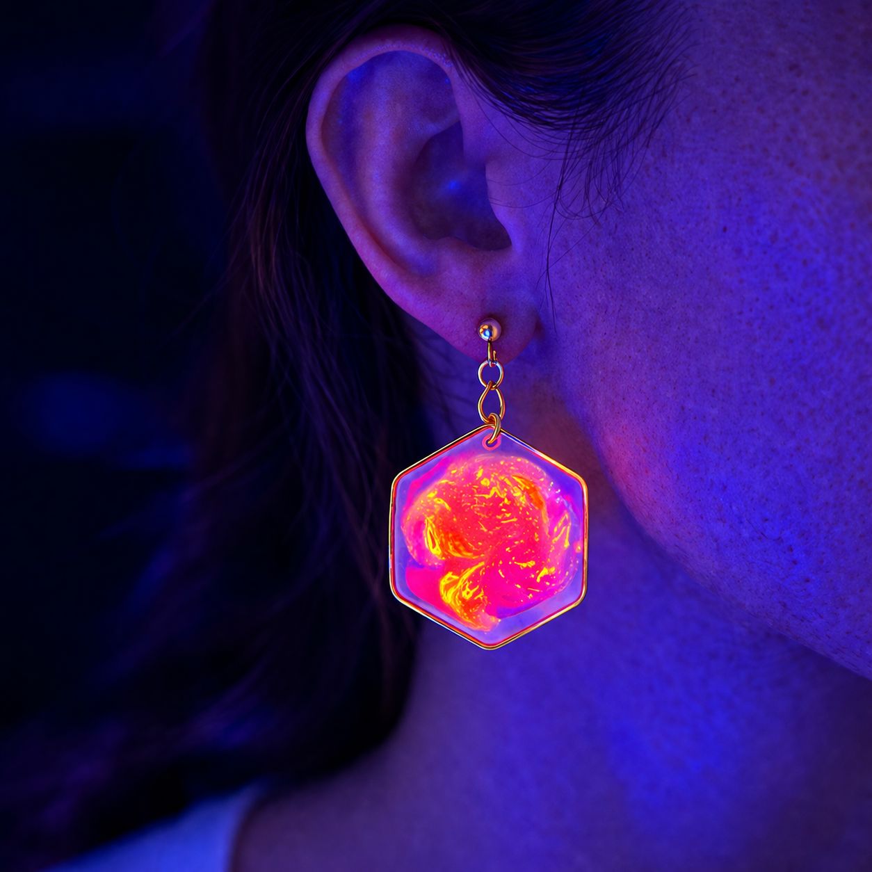 Ilumina tu estilo con una pieza única que brilla con personalidad. Hechos a mano, estos aros incorporan pigmentos fluorescentes que destacan sutilmente en la luz y revelan todo su efecto en la oscuridad.