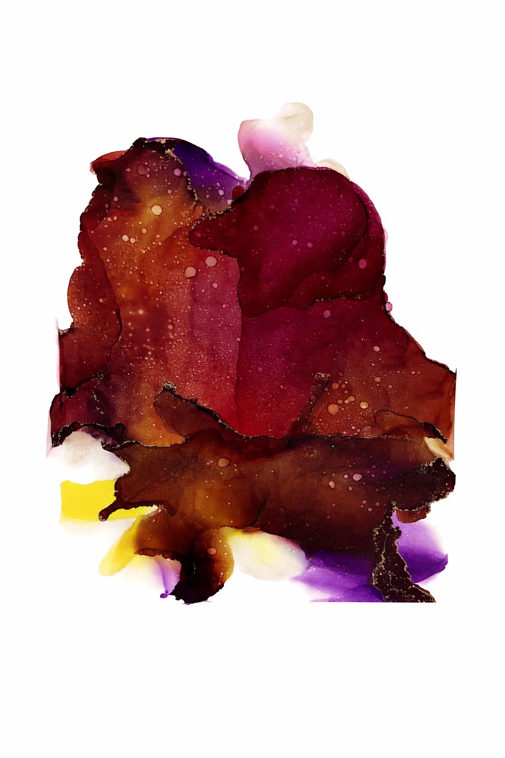 Rojo y vino se concentran en una forma que late hacia adentro, con burbujas suspendidas como memoria contenida.