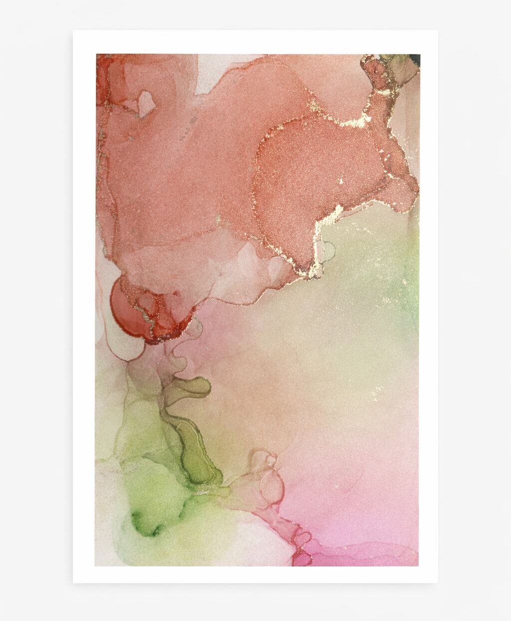 Obra desarrollada mediante capas y expansiones orgánicas de tinta en alcohol, generando transiciones suaves y atmósferas etéreas. Predominan tonos coral, verde y rosado en una composición vertical de flujo descendente, con bordes sutilmente texturizados que aportan delicadeza y profundidad.
