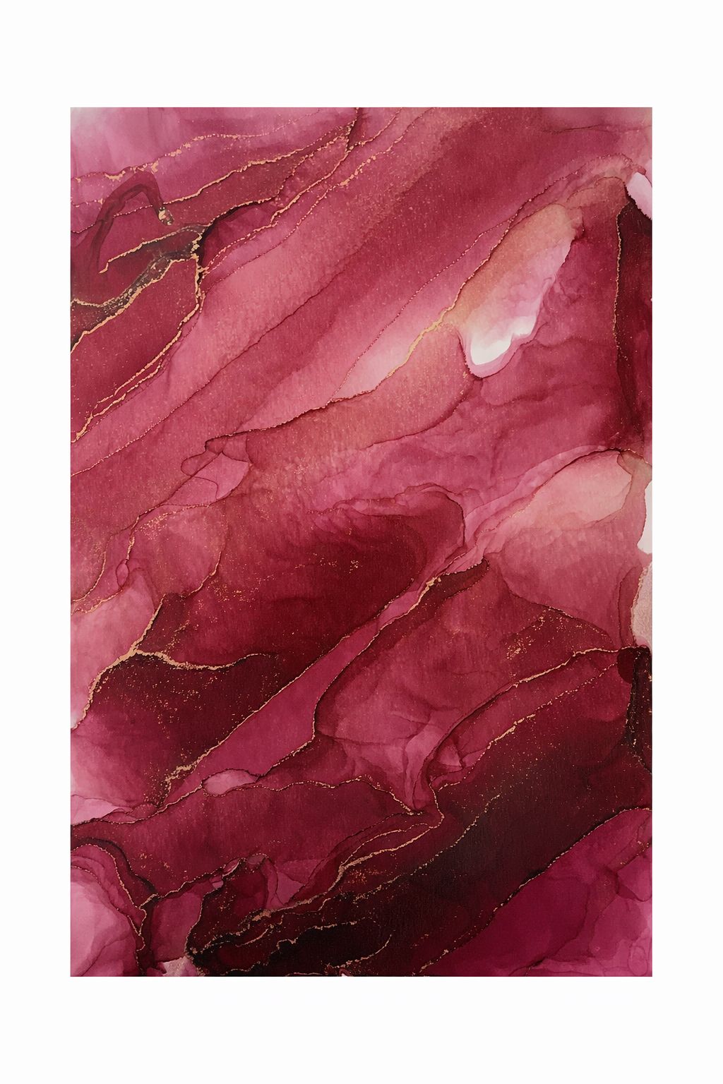 Burdeos y frambuesas se funden en capas fluidas atravesadas por vetas doradas.