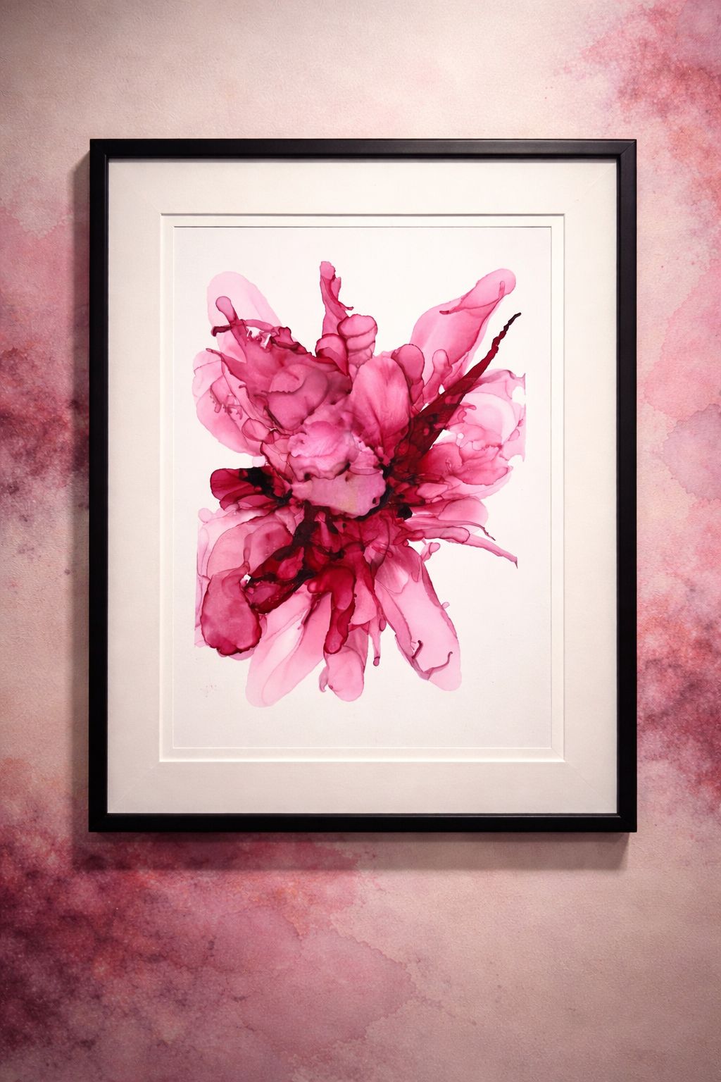 Esta obra explora la expansión del color a través de la fluidez de la tinta al alcohol. Con tonos granate que se despliegan desde el centro y se desvanecen en un rosado, generando una forma que recuerda a pétalos en pleno movimiento. Cada trazo surge de un proceso espontáneo, donde el azar y la técnica dialogan para crear una composición vibrante.