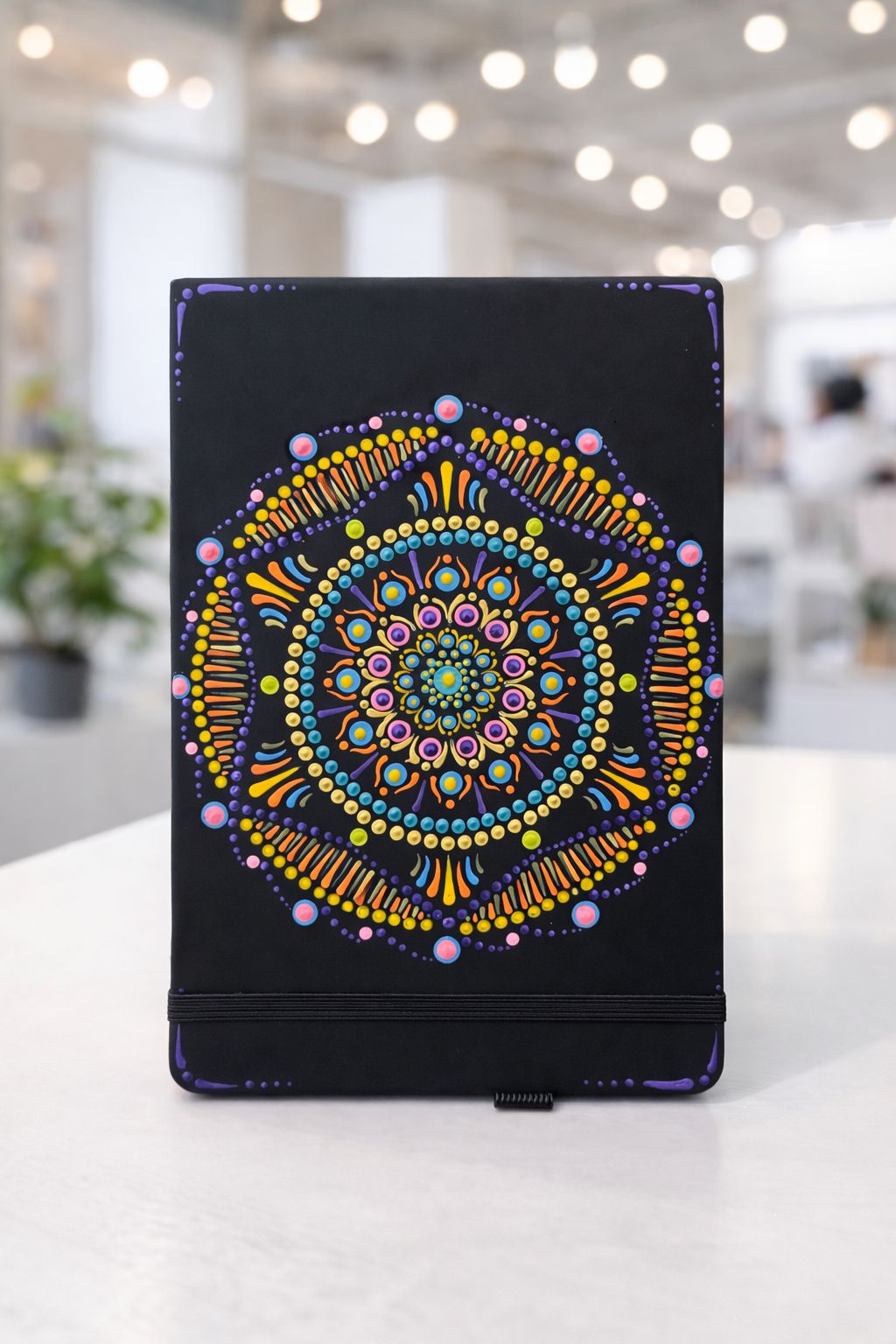 Croquera tamaño 14,5 x 21 cm intervenida completamente a mano con técnica de puntillismo en acrílico.